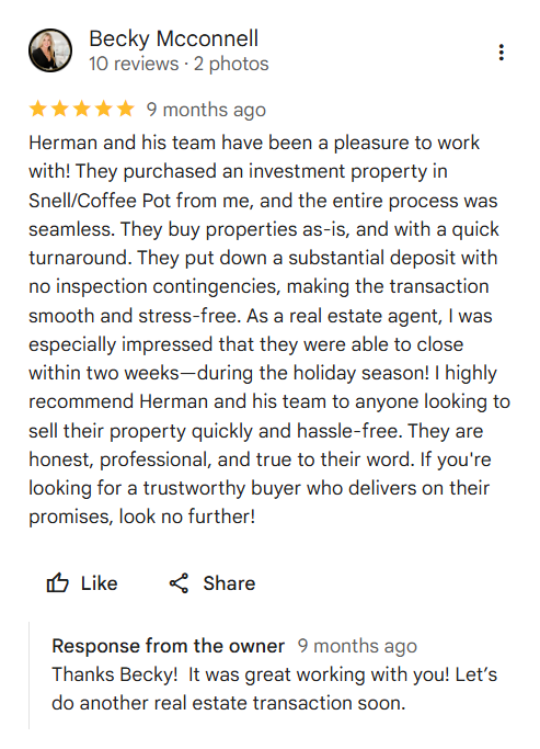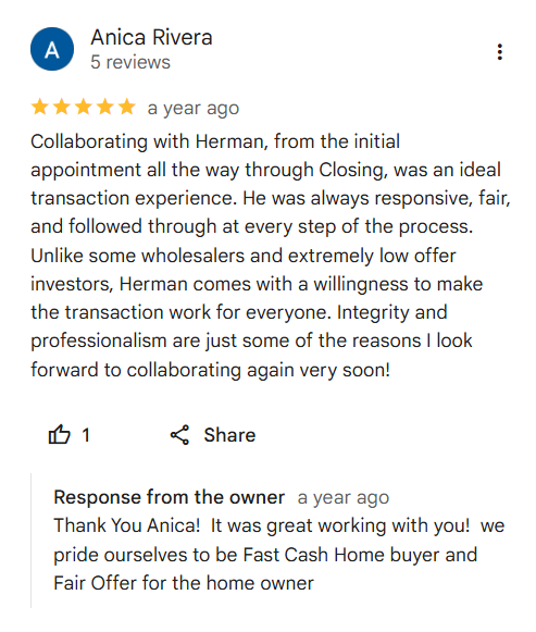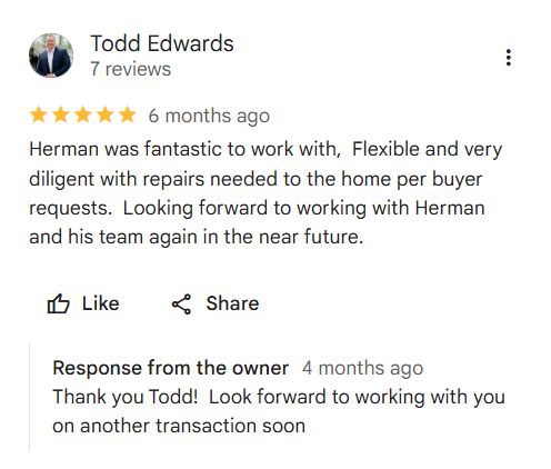 Collaborating with Herman, from the initial appointment all the way through closing, was an ideal transaction experience. He was always responsive, fair, and followed through at every step of the process. Unlike some wholesalers and extremely low offer investors, Herman comes with a willingness to make the transaction work for everyone. Integrity and professionalism are just some of the reasons I look forward to collaborating again very soon!