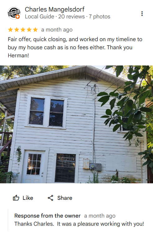 If you decide to accept our cash offer, we will close the deal at a local, reputable title company. Remember, we are a proven, trusted home buyer with a 5-star Google rating for our Tampa, FL office. You can expect your cash in hand in as little as 7 days!